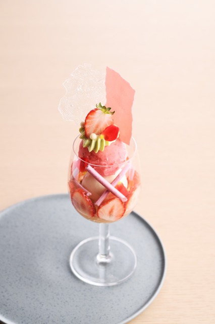 とちおとめのソルベとローズが香るフロマージュブランのジェラートを合わせ、ピスタチオのコクやライチの香りとともにお楽しみいただける華やかなパフェに仕上げました。