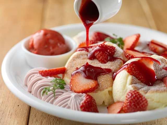 卵・クリーム・チーズをたっぷりと使用したリッチなパンケーキの甘味に、苺とフランボワーズの2種の酸味のバランスが抜群となっています。