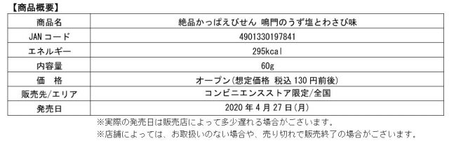 カルビー株式会社(本社:東京都千代田区、代表取締役社長:伊藤 秀二)は、“やめられない、とまらない”でおなじみの「かっぱえびせん」から、お酒のおつまみ向けに素材の組合せにこだわった新商品『絶品かっぱえびせん 鳴門のうず塩とわさび味』を2020年4月27日(月)から、全国のコンビニエンスストア限定で発売します。