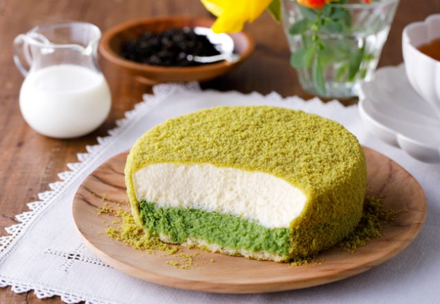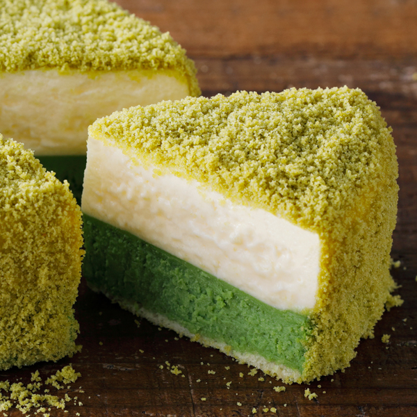 ベイクド層に混ぜ合わせた宇治抹茶の爽やかな苦みが、豊かなミルク感とコクを引き出しています。