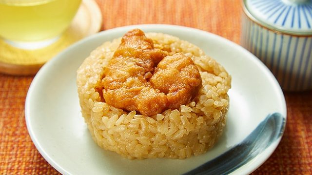 ジューシーに仕上げた唐揚を、生姜焼きのたれで和えてから、醤油ベースで味付けしたおにぎりに乗せました。