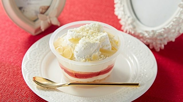 酸味のきいたレアチーズムースに苺ソース、ホイップで甘さを加えました。トッピングのクランチやアーモンドで食感も楽しめるようになっています。