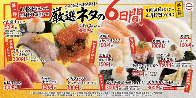 株式会社あきんどスシローは、厳選したとっておきのネタを集めた『厳選ネタの6日間 第一弾/第二弾』を、第一弾は4月8日(水)より、第二弾は4月14日(火)より、それぞれ6日間開催します。