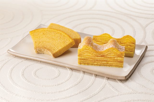 もうひとつの代表作、「ストレートバーム やわらか芽」。まるで「バームクーヘンのカステラ」と呼ばれている、たまご風味たっぷりの一品となっていmす。日本の味覚にふさわしい柔らかさを目指し、たっぷりの卵を贅沢に使ってふっくらとジューシーに焼き上げました。