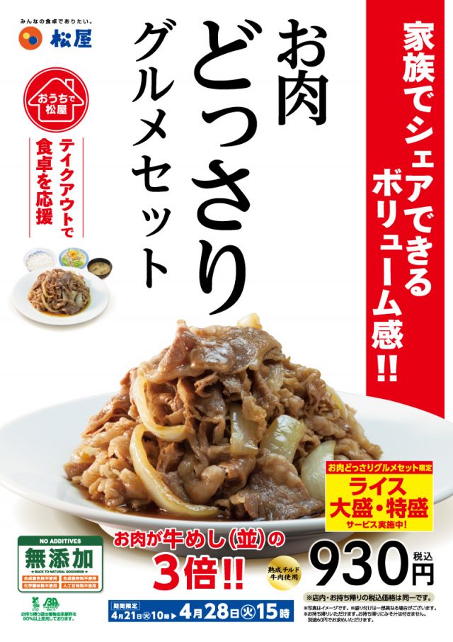 松屋フーズ(本社:東京都武蔵野市、代表取締役社長:瓦葺一利)では、牛めし・カレー・定食・その他丼の「松屋」において、「お肉どっさりグルメセット」を全国の店舗で発売します。