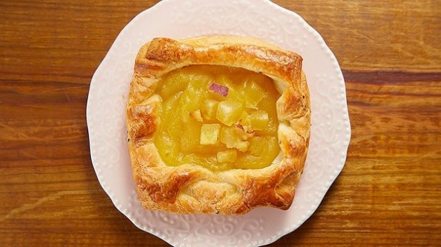甘さたっぷりのカスタードクリームと、リンゴの爽やかな味わいがバランスの良いデニッシュパンとなっています。