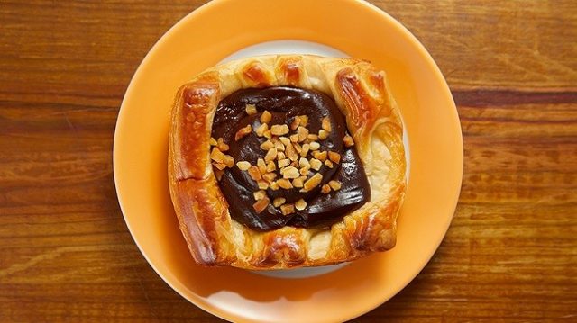 デニッシュ生地に濃厚なチョコクリームをたっぷり絞りました。香ばしいローストピーナッツをトッピングしています。しっとり甘めなチョコクリームとローストピーナッツのサクサク感を楽しめるようになっています。