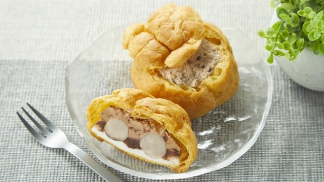 柔らかいシューパフの中に、ミルクムース・ダイスカットした栗を混ぜ込んだ粒あん・白玉だんご2個・粒あんホイップが重なって層を成す、シュークリームの常識をくつがえす驚きの新機軸シュークリームとなっています。