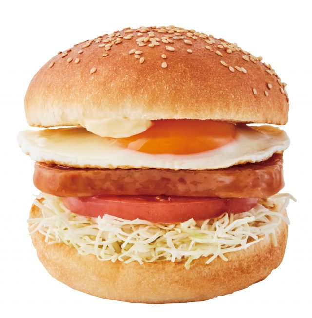 概要 :ハワイで人気のスパム(ポーク)をこんがりと焼き、特製テリヤキソースをたっぷりと絡めました。焼き立ての目玉焼き、千切りキャベツ、トマトをゴマバンズでサンドした具沢山でボリュームのある一品。
