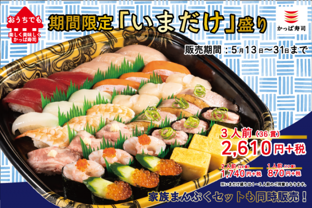 コロワイドグループのかっぱ寿司(カッパ・クリエイト㈱ 本社:神奈川県横浜市 代表取締役社長 小澤俊治)は、2020年5月13日(水)より5月フェア商品を盛り込んだテイクアウト商品『いまだけ盛り』の販売を開始します。