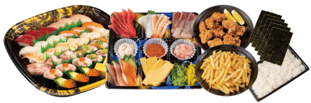 (いまだけ盛り3人前/手巻き寿司セット約3人前/とり唐揚げ2皿分/フライドポテト2皿分)