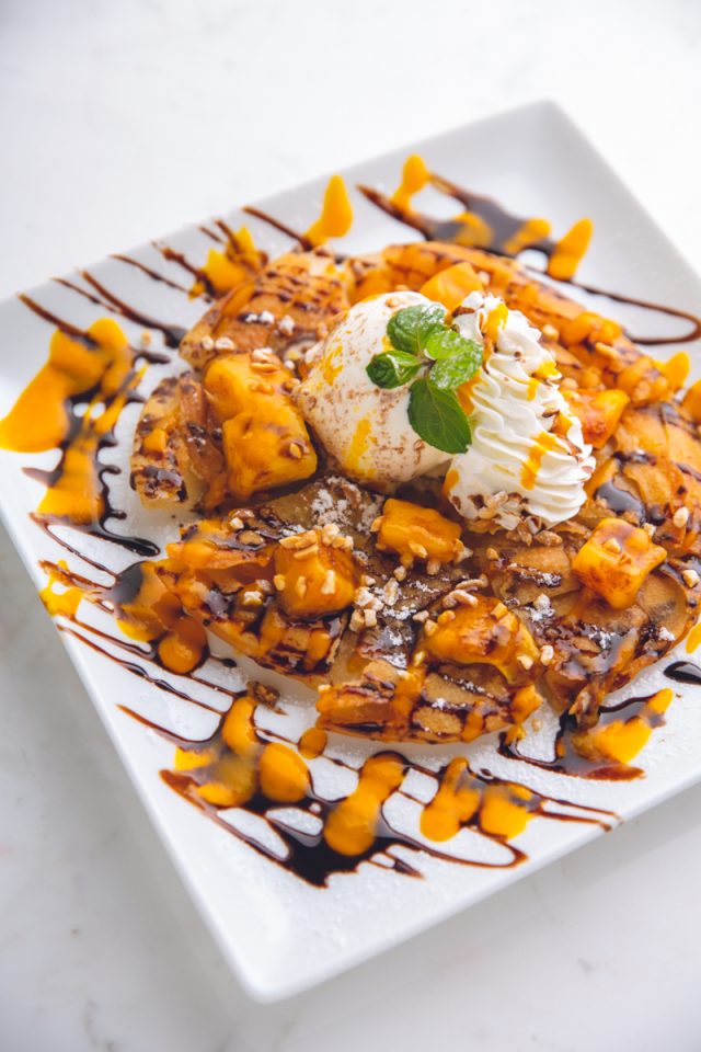サクサクのパラタ(インド発祥のパン)に、フローズンマンゴー、ココナッツアイス、生クリーム、マンゴーソース、チョコレートソースをトッピング。カリカリ食感のピーナッツがアクセント。暑さで食欲のない時の軽いお食事としても◎