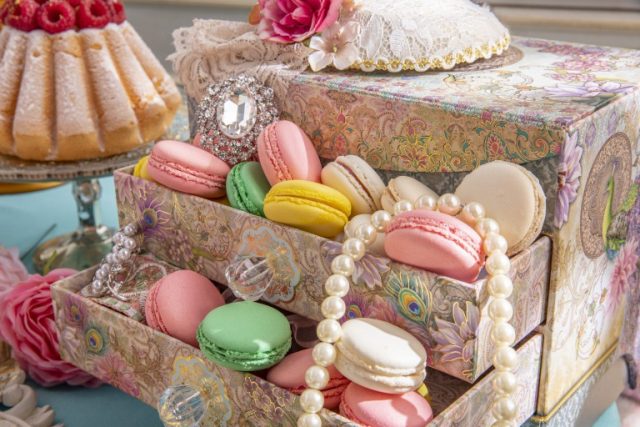 薔薇とラズベリーのルリジューズ「ラ・レーヌMA」、ビターアーモンドムースに軽く焼き上げた桃を花輪のように配した「王妃のフラワーリース」、マカロンやグラススイーツに加え、楊貴妃が好んだと言われるフルーツ、ライチも好きなだけ。美しい二人の妃に思いを馳せながら、優雅なお昼のひと時を過ごせるようになっています。