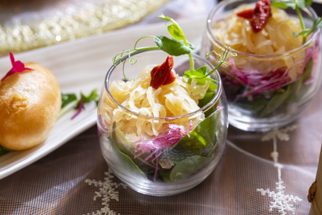 トマトの爽やかな酸味をほのかに感じられる冷製スープは楊貴妃が特に好んだと言われるスーパー美容食材白キクラゲと夏に旬を迎える冬瓜で用意。前菜はコリコリした食感の錦糸クラゲに王朝特製ソースを絡め、クコの実を乗せた1品でさっぱりとサラダ感覚で楽しめるようになっています。