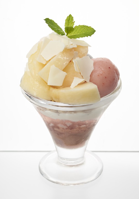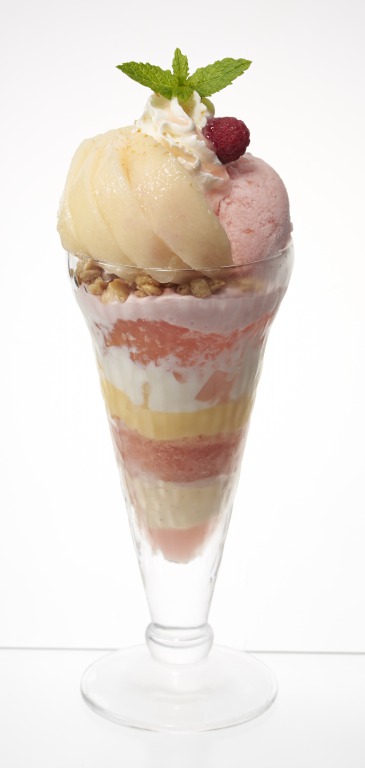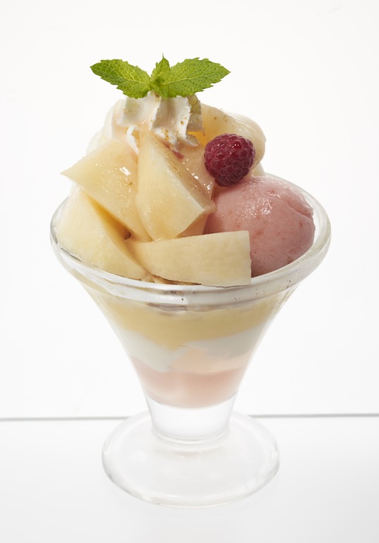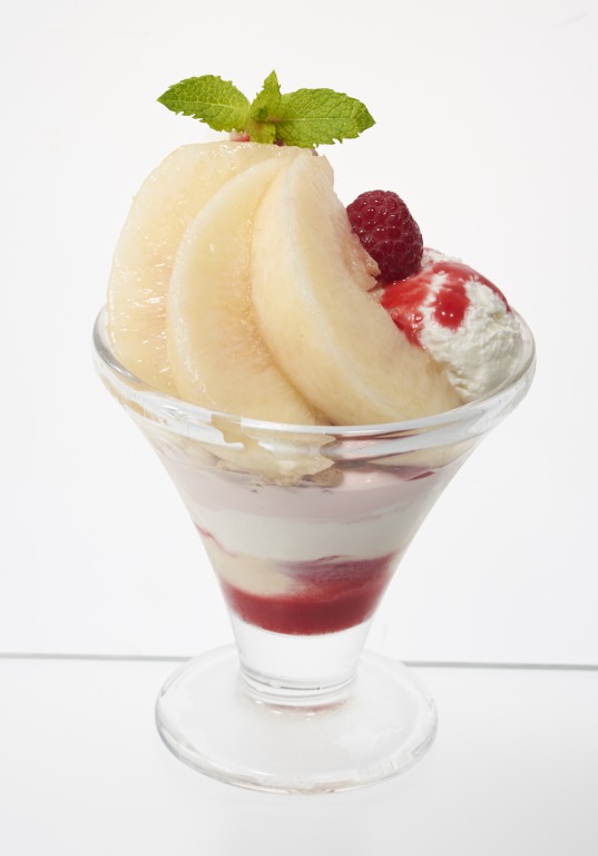 フレッシュな桃、ピーチゼリー、桃クリーム、ピーチソースなど、桃の魅力が存分に詰まったサンデーとなっています。