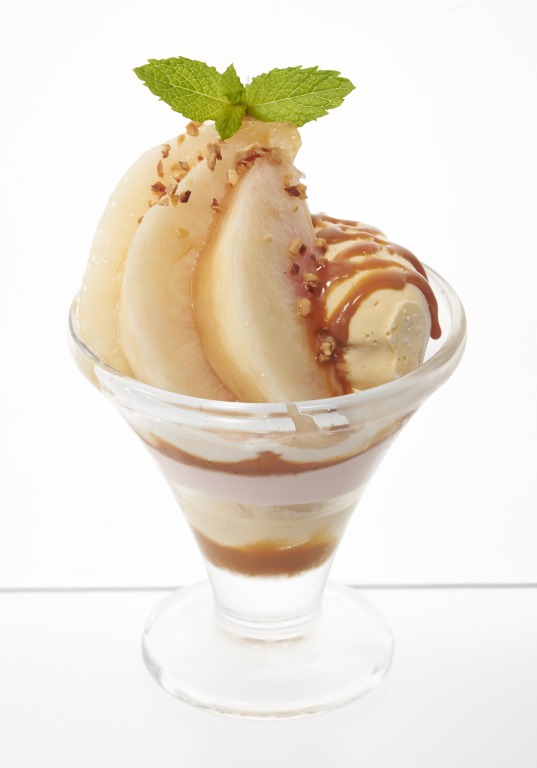 香ばしいキャラメル風味のソースと、フレッシュな桃が相性ぴったりのミニパルフェとなっています。キャラメルソースとクラッシュアーモンド、冷たいバニラアイスの組み合わせもたまりません。