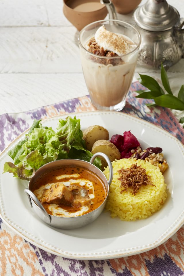 レモンマーマレードを隠し味に、8種のオリジナルスパイスとアーモンドミルク、ヨーグルトで仕上げたクリーミーなカレー。はちみつレモンに漬けたローストチキンをトッピング。2種豆とクスクスのサラダ、カリフラワーとビーツのマリネなどを添えて。