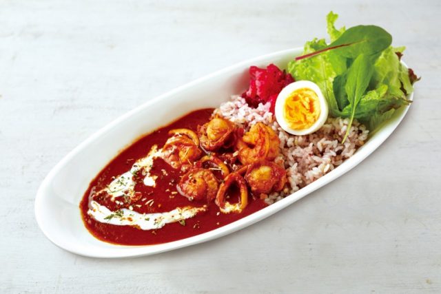 トマトでまろやかに仕上げた欧風カレーに、海老、いか、帆立貝をあわせました。