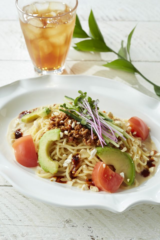 もちもち食感の冷製生パスタにクリーミーなゴマソースを合わせ、ピリっと花椒が香る自家製肉みそ、アボカド、トマトをトッピング。カシューナッツの食感がアクセント。