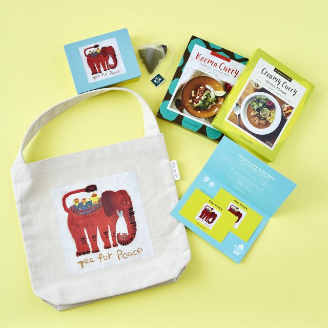 店内メニューで人気のチャイをレトルトカレーと一緒に楽しめるセット。画家・絵本作家のミロコマチコさんのイラストがデザインされた限定トートバッグ入り。ティーバッグの茶葉で簡単にチャイを作ることができ、またティールーム店内でチャイを楽しめるチケットも。