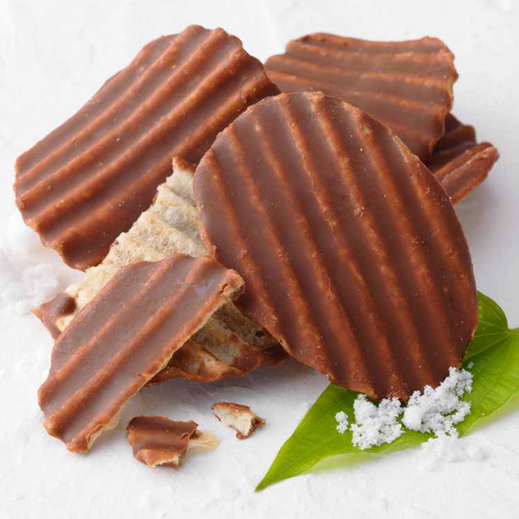 石垣島の海水を原料にした天日干しの「石垣の塩」を使ったポテトチップの片面に、チョコレートをコーティング。まろやかな塩味と甘さがとけ合います。