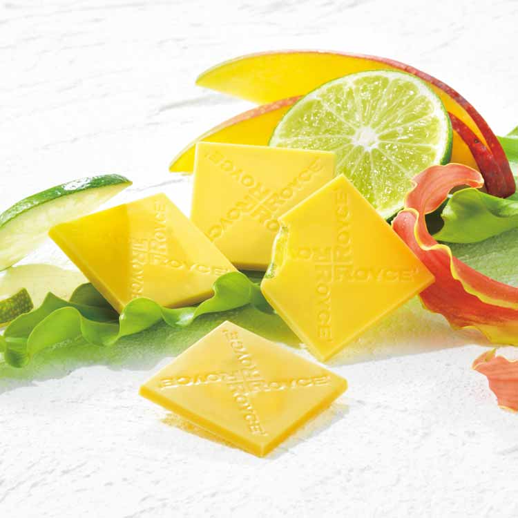 薄く繊細なマンゴーチョコレートのセンターに、すっきりとしたシークヮーサーソースを閉じ込めました。シークヮーサーのさわやかな香りと酸味をマンゴーチョコレートのコクと甘みが包み込む、南国の味わいを楽しめるようになっています。