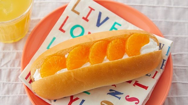 甘酸っぱいみかんと生クリームをトッピングしたどこか懐かしい味わいのコッペパンとなっています。