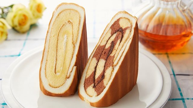 ミルククリーム、チョコクリームを巻いたスポンジケーキをさらにふんわり軽い食感のシャルロットケーキで包んでいます。