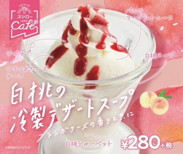 おすしの後にもさっぱりと楽しめる「白桃の冷製デザートスープ」280円(+税)が登場!