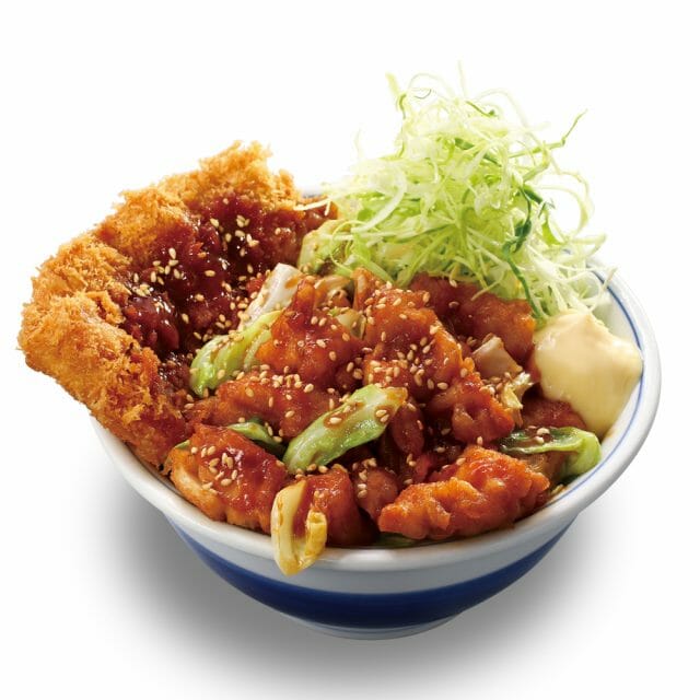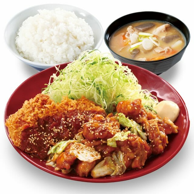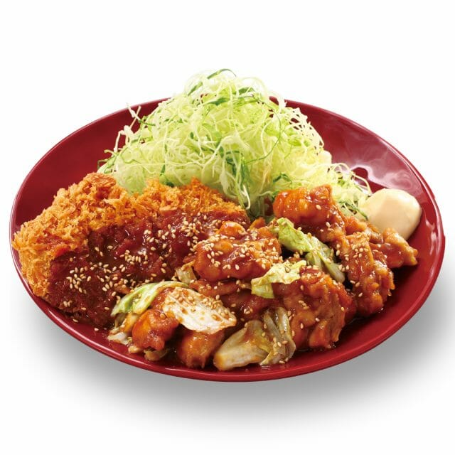 味噌、醤油、にんにくベースのたれに鶏から揚げとキャベツを合わせ焼いた鶏ちゃん焼きとチキンカツを合い盛りにした、暑い夏にピッタリなスタミナ満点のメニューです。