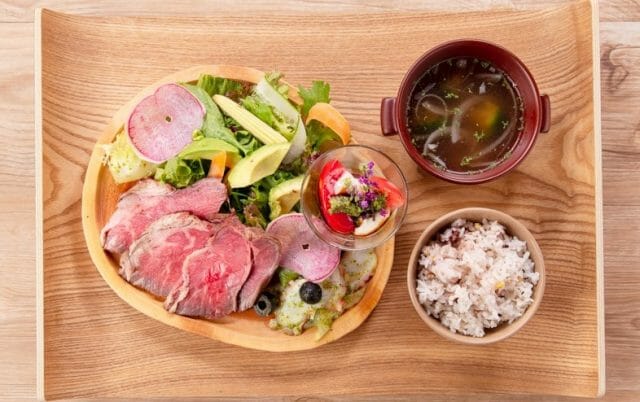 契約農家から仕入れた新鮮な野菜を使用したサラダをメインとした3タイプのプレート料理を用意。お店の中央にあるサラダのショーケースより野菜の具材や6種のデリメニューから好きなものを選べ、セットにはスープ、選べるドリンクまでついて内容はかなりの充実。「選べるメインプレート」を選択すると、ローストビーフなどのメイン料理を楽しめます。小川珈琲監修のこだわりのボタニカルコーヒーやオリジナルブレンドのハーブティーもオススメ。