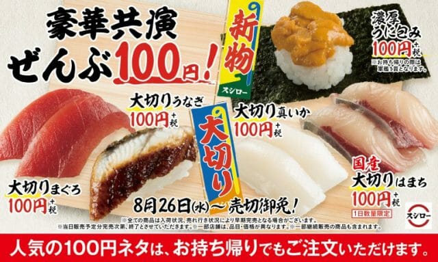 株式会社あきんどスシローは、8月26日(水)より全国のスシローにて、新物の「天然うに」や、人気の「まぐろ」や「はまち」などが大切りで、なんと100円(+税)で楽しめるお得なフェアを開催します。