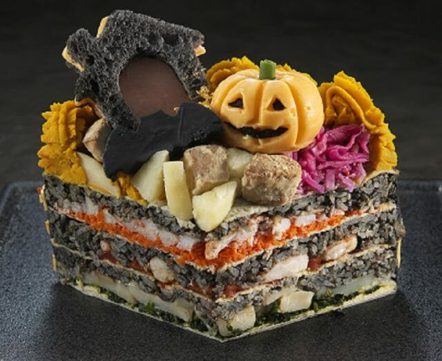 リーガロイヤルホテル伝統のロングセラー商品「海の幸のピラフ」に、イカ墨を加えてハロウィンバージョンにアレンジしたケーキ型ピラフです。ジャック・オ・ランタンやコウモリ、おばけ、ミイラ男など、ハロウィンの人気キャラクターが集合した、フォトジェニックなひと品に仕上げました。