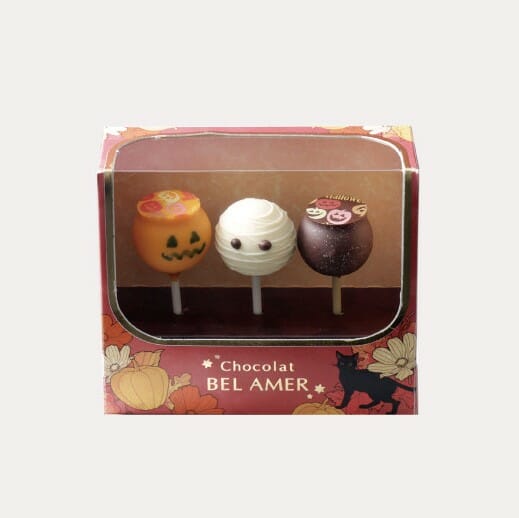 パンプキン、ミイラ、ビターアーモンドの3種が入った"ロリポップショコラ"のギフトセットを用意しました。