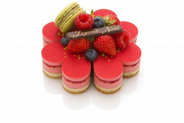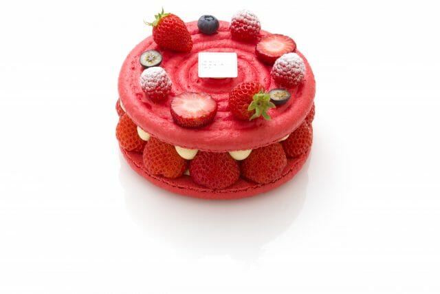 鮮やかなピンク色が目を引く、「ノエル フレジエ」は、フランスの伝統菓子“フレジエ”をアオキのスペシャリテであるマカロン生地でアレンジした新作のクリスマスケーキ。