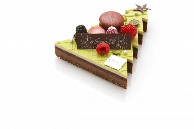ピスタチオのクリームに濃厚なショコラのクリームとフランボワーズを重ねた新作のクリスマスケーキ「サパン ショコラ ピスタッシュ」。ショコラとピスタチオが織りなす重厚感のある味わいにフランボワーズの優しい酸味が溶け合い、三位一体の美味しさを奏でます。底に忍ばせたクランブルショコラの軽やかな食感がアクセントに。うっとりするようなピスタチオとショコラのマリアージュが楽しめるようになっています。