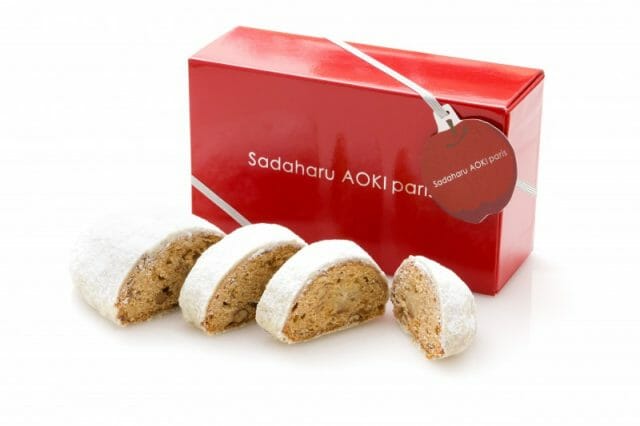 クリスマスを待ち望むあいだに少しずつスライスして食べ進めていく伝統的なアドベント菓子“シュトーレン”。「シュトーレン ポム キャラメル」はキャラメルとリンゴの酸味が響き合う風味豊かな新作となっています。フランス産発酵バターの芳醇な香りを閉じ込めたキャラメル風味の生地に、スペイン産マルコナ種のアーモンドを使用したマジパンや、リンゴ、ラムレーズン、香ばしいナッツを加えた贅沢な味わい。周りの粉糖にはアオキオリジナルの紅茶「テ ポム キャラメル」の茶葉を合わせて香り高く仕上げています。