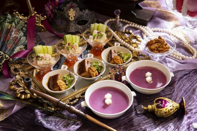 デザートはホテル1階「マーブルラウンジ」で開催中のスイーツビュッフェ『マリー・アントワネット 王妃のマスカレード』よりシェフ選りすぐりのスイーツをワゴンサービスにて届します。高貴な紫を基調に、仮面や香水などを用いてマリー・アントワネットの世界観で装飾されたワゴンには、フレッシュの巨峰入りラベンダー風味のジュレ「アメティスト」やシャンパン風味のムースの中に赤ワインで煮詰めた無花果のコンポートを忍ばせた「パスパルトゥ」、ローズの香りをまとったハート型のマカロンサンド「フランスの薔薇」はもちろん、楊貴妃が好んだライチを用いたグラススイーツも用意します。ランチタイムに人気のスイーツビュッフェのスイーツと、本格点心をダブルで楽しめる『美しき妃たちの午餐会』で、歴史に散った美しくも数奇な運命をたどった妃・后たちに思いを馳せるひと時はいかがでしょうか。