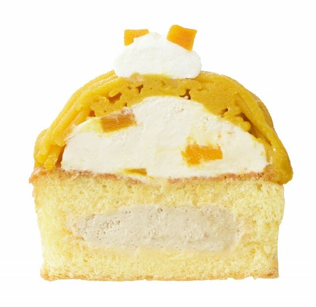 秋の味覚、かぼちゃをたっぷり使いました。ほんのりシナモンが香るかぼちゃ餡の下にはかぼちゃ甘露煮ダイス入りキャラメルクリームが、スポンジの中には塩キャラメルカスタードが隠れています。かぼちゃの甘みと、ほろ苦いキャラメルがマッチしたモンブランです。