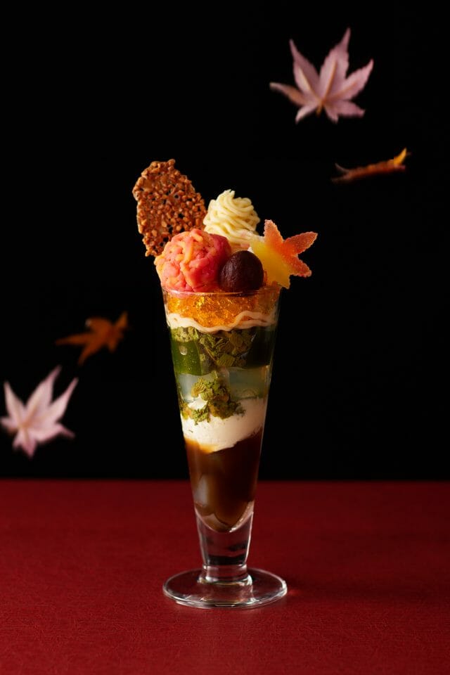 『もみじ抹茶パフェ』は、抹茶餡の紅葉きんとん、紅葉ゼリー、栗の渋皮煮、さつまいもクリーム、チュイールアーモンドクッキーをあしらい、グラス上に実りの秋を表現。グラスの中には、抹茶ゼリーやほうじ茶蜜など、お茶屋ならではの具材で宇治茶の魅力を詰め込みました。美しい日本の秋を、目で、舌で、味わう季節限定パフェです。