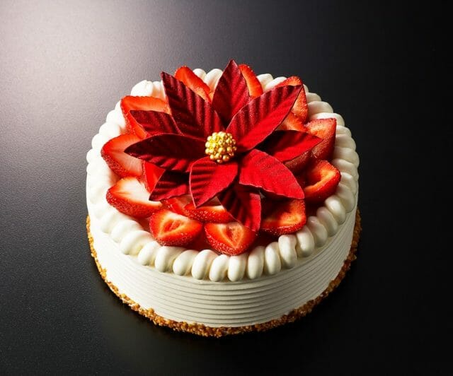 ポインセチアをチョコレートで表現したデザインで、女性にもおすすめのショートケーキです。いちごの甘酸っぱい香りに柔らかなスポンジとバニラ風味のクリームが口の中に広がります。