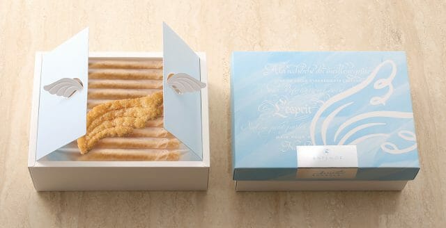 天使の羽をモチーフにしたサクサクの食感のパイです。ニュージーランドの広大な牧場で育てられた乳牛から作られた香り高いバターを幾重にも折り込み、職人が心を込めてひとつずつ焼き上げました。優しいペールブルーの天使の羽をあしらったパッケージの贈答用タイプと、自宅用の簡易パッケージを用意しています。