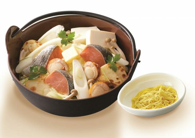 北海道産の秋鮭を使用し、白味噌も北海道産のものを使ったこだわりの鍋です。具材はじゃがいもや帆立、豆腐が入り、そこにバターが入った本格的な石狩鍋です。(ラーメンorうどん付)