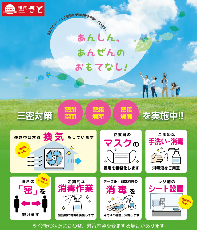 「和食さとでは新型コロナウィルス感染症予防対策として、店内各所の定期的な消毒作業や、レジ前のシート設置による飛沫感染防止策などの予防対策を適宜実施しております。」