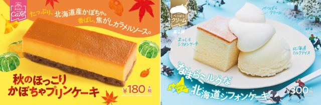 今の季節に食べたい“秋スイーツ”が登場します。「秋のほっこりかぼちゃプリンケーキ」180円(+税)は、北海道産のかぼちゃをたっぷり使用。かぼちゃのやさしい甘みと、カスタード部分に加えた練乳のやわらかでコクのある風味を楽しめるようになっています。
