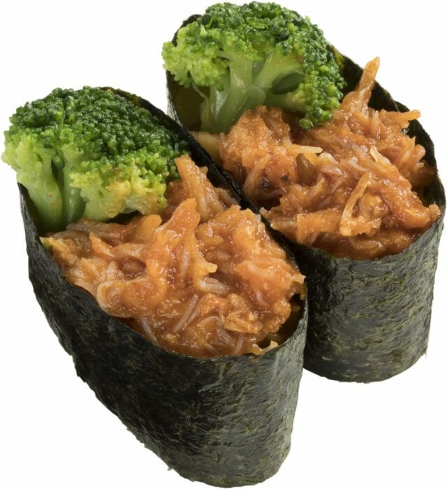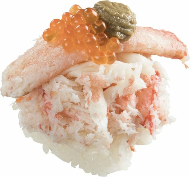 今回の注目商品は、「生本ずわい蟹」。かにの中で最も贅沢と言われる本ずわい蟹を生のままで用意します。甘みが抜群でとろっとした身を堪能できる一皿が、驚きの150円(+税)で味わえるようになっています。「ボイル本ずわい蟹2貫」は、ボイルすることでかにの甘みをぎゅっと凝縮させ、なんと2貫100円(+税)で提供するほか、「3種のかにてんこ盛り」300円(+税)は、てんこ盛りにした3種のずわい蟹の上にかに味噌といくらを乗せ、一皿でかにの魅力を余すことなく楽しめる一皿となっています。