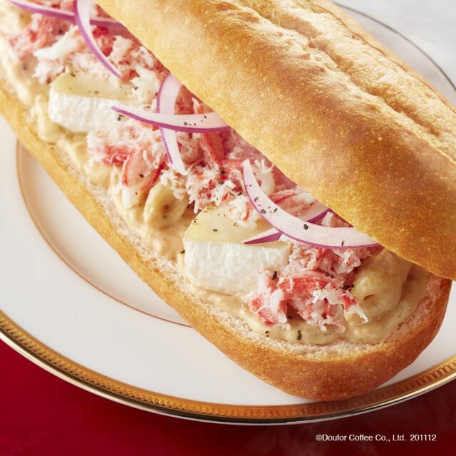 かにの豊かな風味とまろやかな味わいのペンネ入りかにグラタンの上に、カマンベールチーズをのせて温めました。さらに、かにほぐし身は旨味を味わっていただくために温めた後にもトッピングしています。最後にレッドオニオンをのせて、ブラックペッパーで味のアクセントに。冬の味覚″かに″の旨味がたっぷり味わえる冬限定ミラノサンドです。