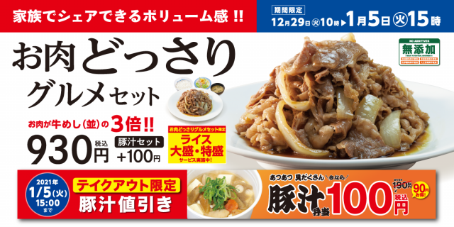 松屋フーズ(本社:東京都武蔵野市、代表取締役社長:瓦葺一利)では、牛めし・カレー・定食・その他丼の「松屋」において、2020年12月29日(火)より「お肉どっさりグルメセット」を発売します。