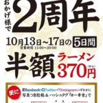 株式会社ウインズジャパンは、博多豚骨ラーメン専門店『元祖泡系 博多一幸舎 池袋東口店』のオープン2周年を記念して、2017年10月13日(金)~10月17日(火)の5日間限定でラーメン1杯が半額になる ...