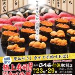 “本格寿司をお手頃価格で”がモットーの「寿司・和食 築地日本海」では、東京メトロ東西線の行徳駅前店において本鮪大トロ、ウニ、イクラ、ぼたん海老やアワビなど高級ネタを含む72種の寿司すべてを対象とする『 ...